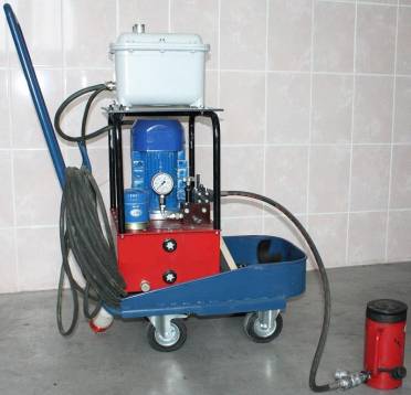 Данная мобильная установка представляет собой собранный в одном узле гидравлический домкрат с гидростанцией, питающейся от электросети. Установка легко перемещается одним человеком и позволяет вывешивать колесные пары для выполнения различных операций при обслуживании и ремонте локомотивов. Установка удобна и легка в использовании.