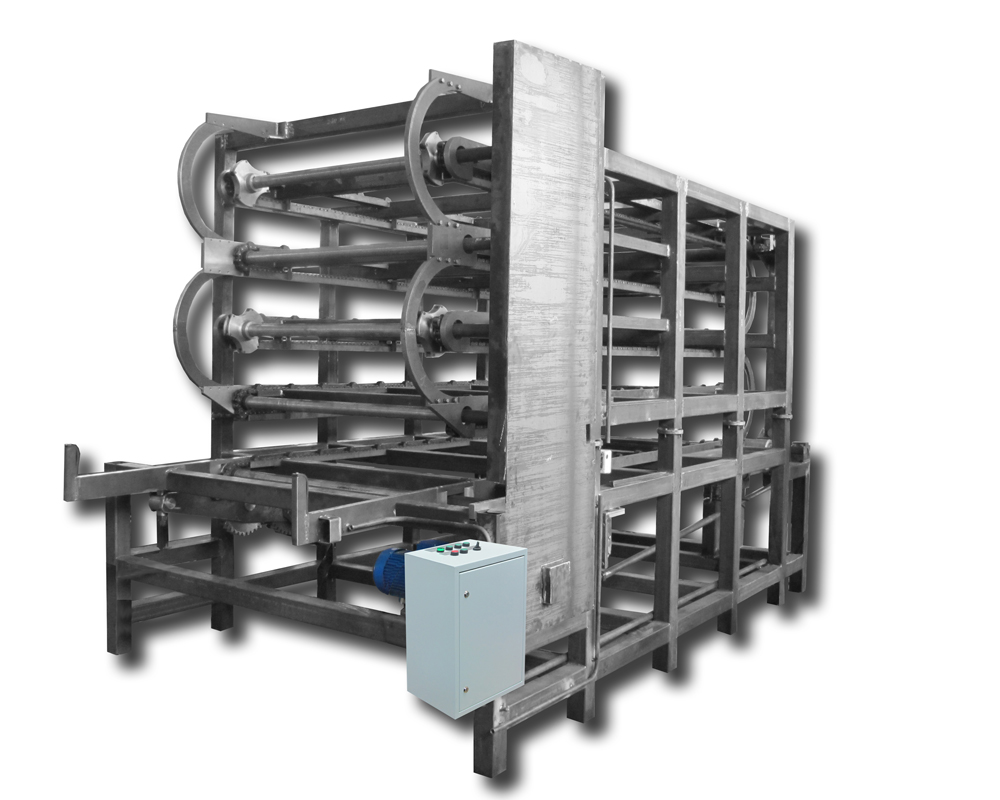 Многоярусный накопитель осей состоит из: манипулятора с гидравлическим приводом для перемещения оси от предыдущей позиции на верхний ярус накопителя и непосредственно накопителя. Оснащённого цепным механизмом перемещения осей с электромеханическим приводом.